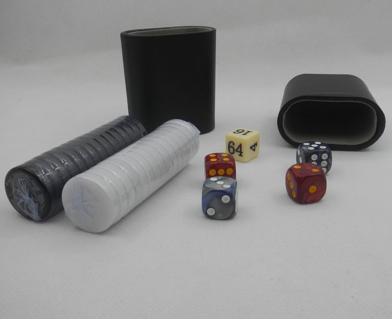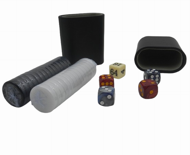 • Includes two pairs of dice (one black, one white), two dice cups with decorative running stitches, backgammon doubling cube, and backgammon playing pieces set